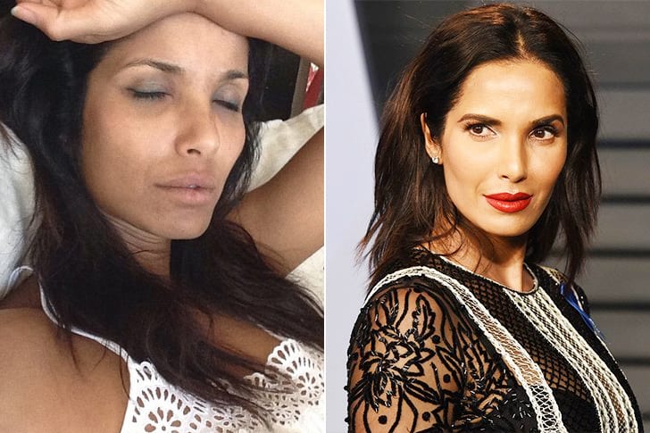 Padma’s complexion allows her to go makeup-free without you even knowing the difference. Although she’s not one to be in public without makeup, she does makeup tutorial videos, which start with her wearing no makeup.  Padma started her show in 2020 called Taste The Nation With Padma Lakshmi.