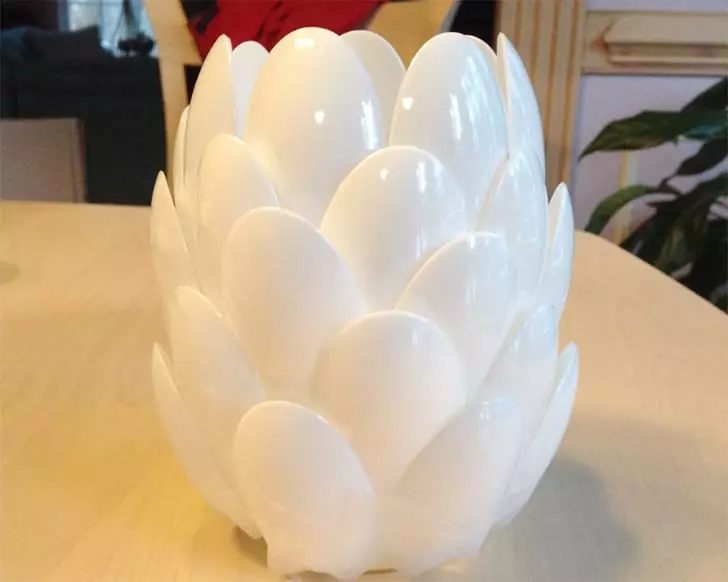 Those bunch of plastic spoons lying around? Transform them into a stunning decorative piece! All you need to do is cut off the handles, leaving just the spoon heads. Arrange them in a circular pattern on a piece of cardboard or a mirror base, layering them to resemble the petals of a flower.
