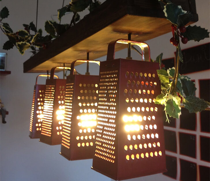 Transform old graters into lampshades to brighten your space with a quirky twist! This hack gives your kitchen a charming, rustic look. The perforated sides of the grater also create interesting light patterns, making these DIY lamps both decorative and practical for any room.