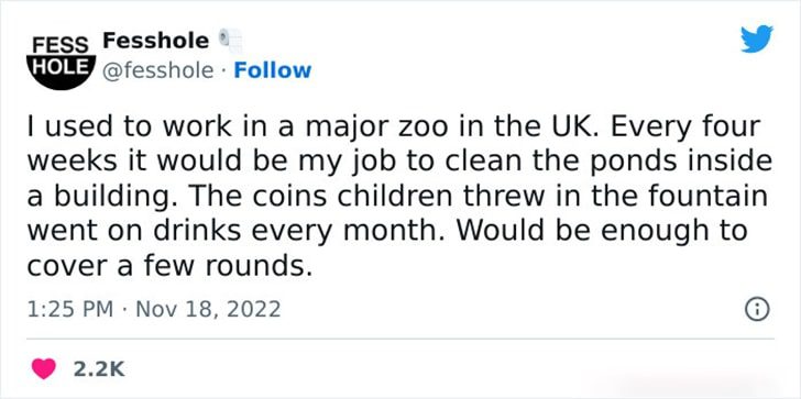 Interestingly, children throw coins into ponds as a modern take on ancient wishing wells, hoping their wishes will come true. While working at a major zoo in the UK, an employee found a clever way to use those discarded coins. The only wish coming true was that of this employee who accumulated enough of those coins to cover a few rounds of drinks each month.