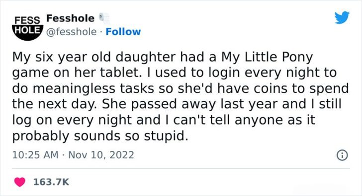This heartbreaking yet touching confession reveals a parent’s deep love for their child. A father would log into his daughter’s My Little Pony game every night to complete tasks and earn coins for her to enjoy the next day. Tragically, up to a year after she passed away, he continued to log in every night, unable to break the habit.