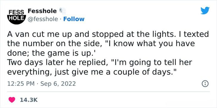 However, the van driver responded days later, suggesting he would confess everything to his wife and asking for a few days. Cutting off other drivers is one of the worst habits on the road, often leading to near-collisions. This unexpected twist hints at the van driver hiding a significant secret, leaving us curious about his cryptic reply.