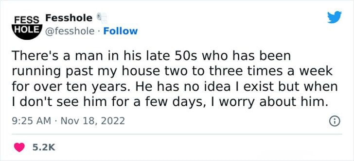 For over ten years, a man in his late 50s has jogged past a house two to three times a week. Unbeknownst to him, the homeowner has grown accustomed to his routine and worries when he doesn’t appear for a few days. This silent concern reflects a common human tendency to form connections, even with strangers.