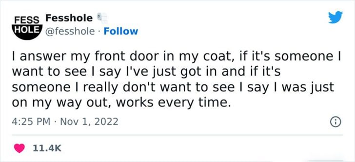 One individual has perfected a clever trick for managing unexpected visitors. By answering the front door in a coat, they create the illusion of either just arriving home or being about to leave. If the visitor is welcome, they say they’ve just got in. If not, they claim to be heading out.