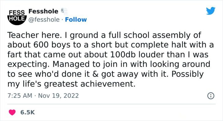 This incident is funny because it involves an unexpected, loud noise disrupting a serious setting, and the teacher’s quick thinking allowed him to avoid blame. Farting is considered a private matter due to cultural norms and the desire to maintain personal dignity and comfort in social situations. This memorable moment stands out as the teacher’s most unexpected achievement.