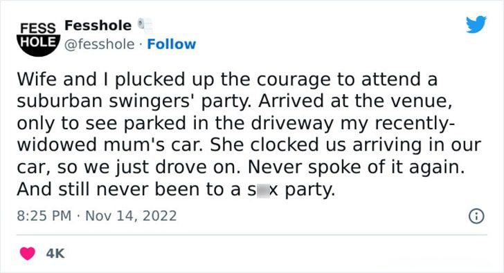 Curiosity and a sense of adventure led a couple to attend a suburban swingers’ party. Swingers’ parties involve couples who consensually swap partners for physically intimate activities, aiming to explore and enhance their relationships. Upon arriving, they were shocked to find the wife’s recently widowed mother’s car in the driveway.