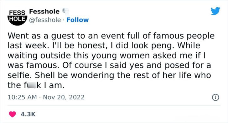 Desiring a taste of fame, a guest at an event filled with celebrities seized an unexpected opportunity. Because he looked particularly stylish that evening, a young woman approached him and asked if he was famous. Craving the thrill, he confidently said yes and posed for a selfie.