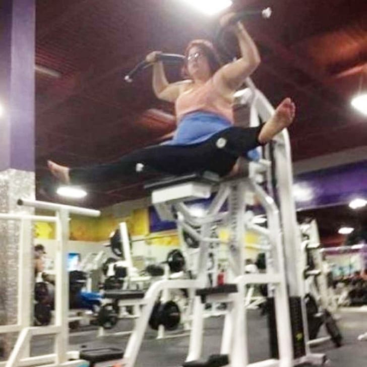 Climbing to the top of the equipment, she stretched her legs as far as she could to make for some never-seen-before workout moves. We have to compliment her flexibility, which is very impressive! But what about her feet? Miss, don’t you know you’re supposed to wear shoes when using any type of community equipment? We pity the person who’s going to use the pull-up machine next…