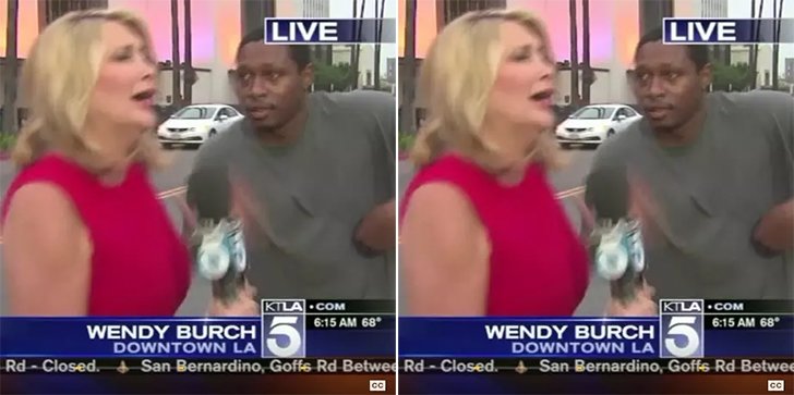 ロサンゼルスの夏季オリンピック招致に関するレポートをしていた地元レポーターのウェンディ・バーチは、ある男がフレームに寄りかかって手を腰に当て、彼女のセグメントにビデオボムを仕掛けようとしたとき、不意を突かれました。ウェンディは驚いて叫び声を上げ、飛び跳ねました。
