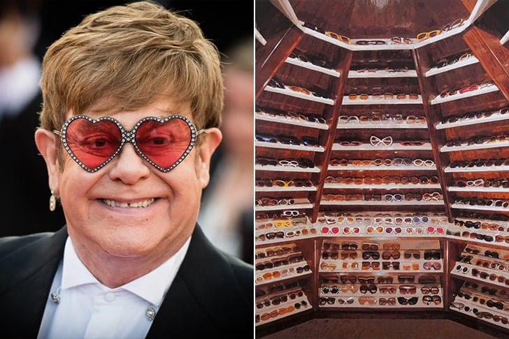 Elton John is known for his eccentric collection of sunglasses. John explained that expensive electronics never fascinated him and that he’s more interested in sunglasses. He revealed that he owns more than 250K pairs, with some going back as far as the ’70s.