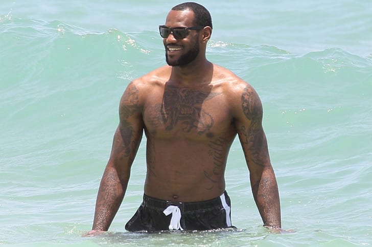 The picturesque beaches of the Bahamas, known for their pristine waters and vibrant marine life, offered the perfect getaway for LeBron James in 2010. Sporting simple black swim shorts with white accents, his tattoos added to the island’s casual elegance.