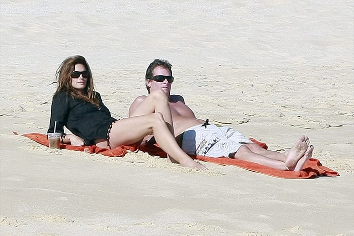 Thanksgiving 2011 found Cindy Crawford and Rande Gerber basking in the sun in Los Cabos, a destination famed for its stunning beaches and luxurious resorts. Casually lounging on an orange towel, Cindy’s elegant black cover-up and bikini ensemble paired perfectly with Rande’s patterned swim shorts and their matching sunglasses.