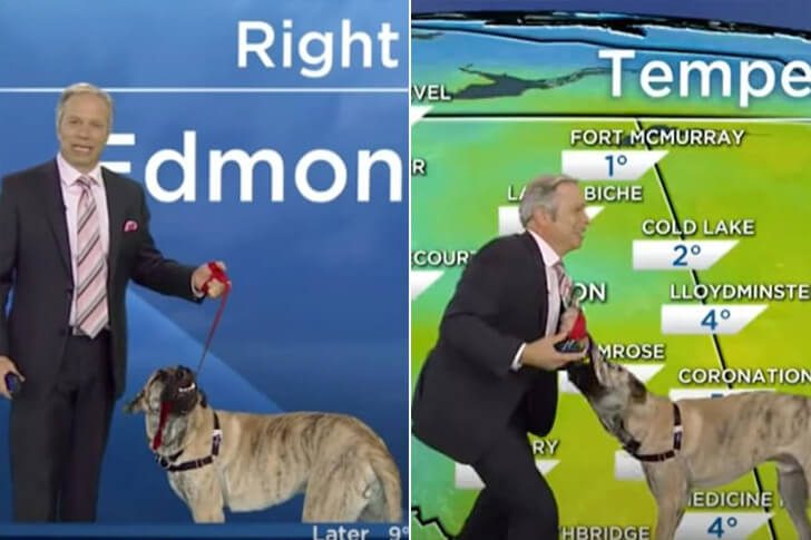 Global Edmonton weatherman Mike Sobel got more than he bargained for when he invited Ripple, a high-energy Shepherd‑Mastiff rescue, on air in 2014. Ripple yanked on his leash, leapt around, and nearly dragged Mike across the green screen map as it was more interested in tug-of-war than temperatures.