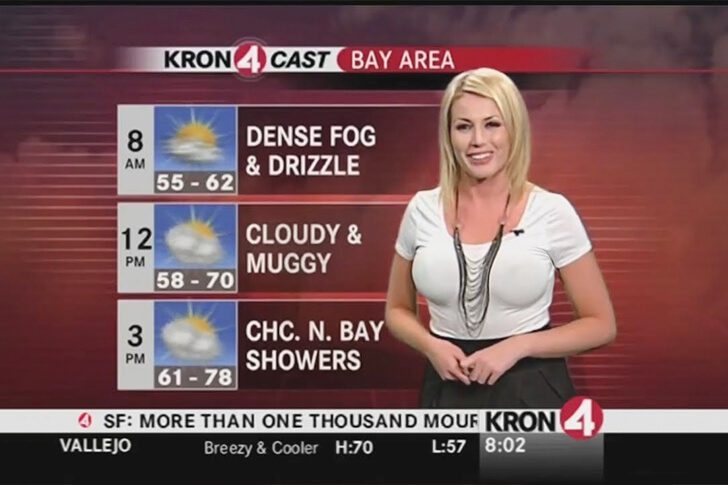 In 2010, KRON 4 meteorologist Jacqueline Bennett became a viral sensation when her tight white top turned translucent under blazing studio lights. The clip spread like wildfire because it wasn’t contrived, and she handled it like a pro, never skipping a beat or cracking under the glare.