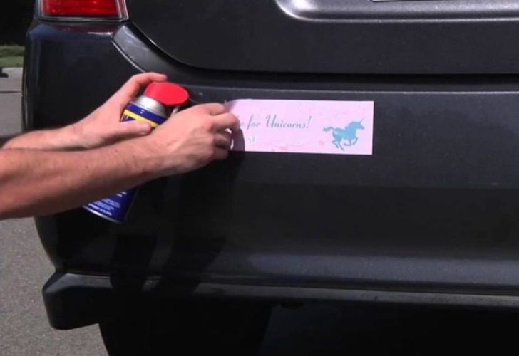 Adesivos são ótimos, seja para demonstrar causas que você apoia ou simplemente fazer as pessoas rirem, mas são muito difíceis de retirar quando se precisa, ficando presos no decalque do carro. Para removê-los sem correr o risco de danificar seu possante, aplique um pouco do WD-40 para facilitar.