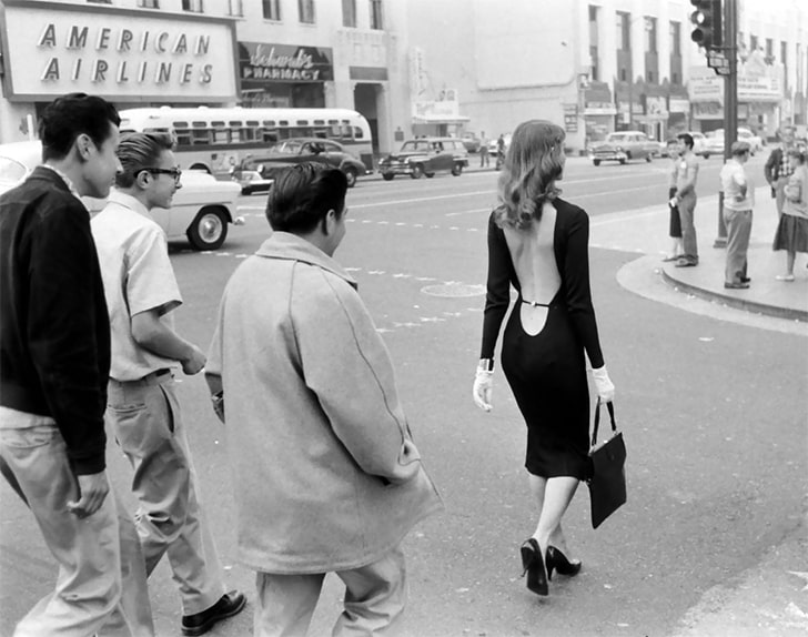 Vikki Dougan, quizás la modelo más infravalorada de los años 50, capturó la atención con su audaz vestido de espalda descubierta en esta icónica fotografía de Ralph Crane.
