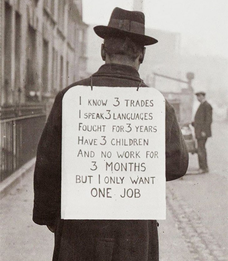 Sin embargo, en la década de 1930, encontrar trabajo era una tarea considerablemente más difícil, como nos muestra esta fotografía histórica. En aquel entonces, los desempleados tenían que recurrir a métodos más rudimentarios, como llevar carteles en la espalda para mostrar sus habilidades y buscar desesperadamente una oportunidad laboral. Esta imagen refleja los desafíos que enfrentaban las personas en tiempos pasados para acceder al mercado laboral.