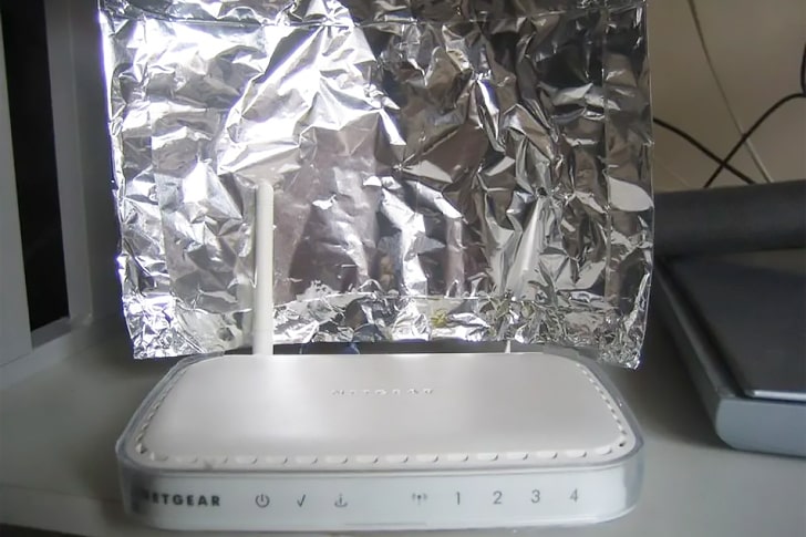 Embora você possa não estar pronto para investir em seu próprio chapéu de papel alumínio, um pouco de papel alumínio em volta do roteador sem fio pode fazer maravilhas. Se você achar que sua conexão é fraca, lenta e geralmente não confiável, a folha de alumínio pode fornecer uma solução. Comece pegando um pedaço de papelão simples e cobrindo-o com papel alumínio. Em seguida, coloque a aba em volta do roteador, de preferência na parte traseira, onde os cabos são conectados. O alumínio deve fornecer um impulso ao seu sinal WiFi que tornará sua Internet mais confiável. Os problemas de conectividade acabaram!