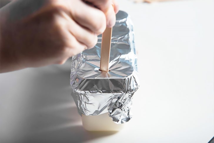 A folha de estanho não só mantém os palitos de picolé no lugar como os ajuda a congelar de forma rápida e uniforme, e ah, ia esquecendo: ele também serve como um coletor de gotejamento.