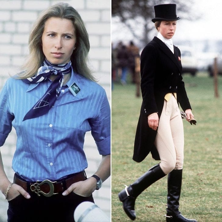 Princess Anne shines in this 1973 photo from her visit to Russia, where she sported a knotted neck scarf, pinstripe button-down top, black pants, and a belt. Known for her equestrian prowess, Anne has amassed numerous medals at the European Eventing Championships and even represented the United Kingdom at the Olympics.