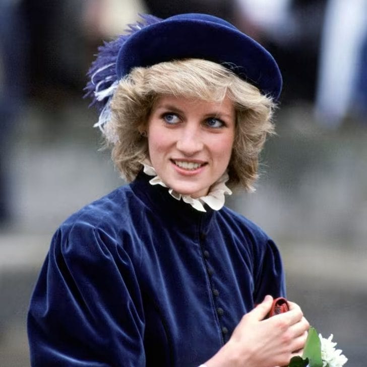 During a 1985 visit to Nottingham, Princess Diana wore a striking blue velvet suit by Caroline Charles paired with a John Boyd hat. To prevent the hat from being blown off by strong winds, she ingeniously used a comb to keep it securely in place.