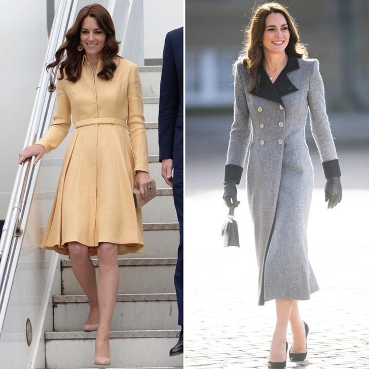 As seen in multiple photos, Kate Middleton is renowned for her love of coatdresses, looking impeccable in these soft yellow and gray tweed versions in this photo. This versatile attire keeps her warm while ensuring she stays fashionable.