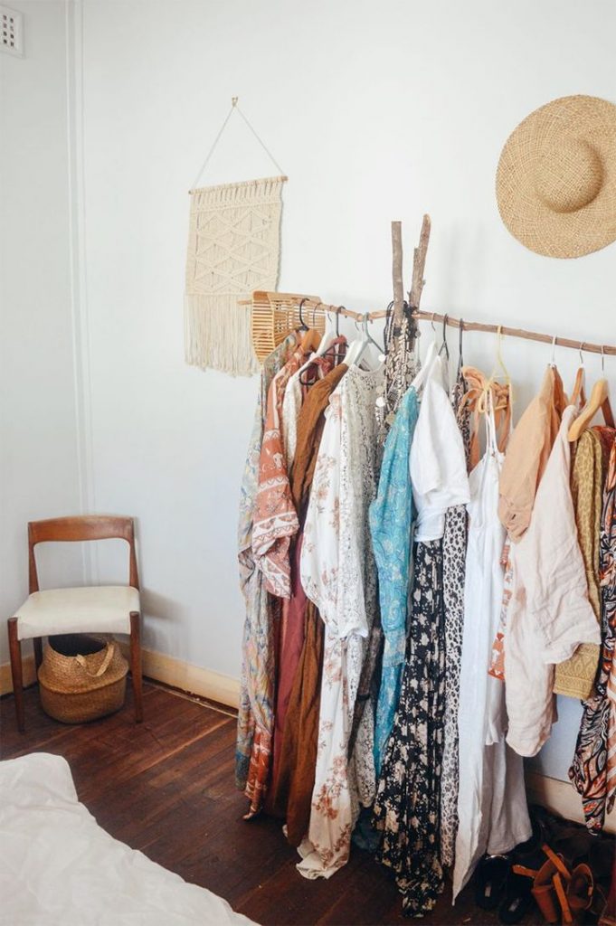 Transform your room with a stylish and functional DIY wall-mounted clothes rack that captures the essence of boho chic. This easy-to-create solution involves hanging a wooden rack for the garments on one end and attaching baskets on the other to balance and stabilize the structure.
