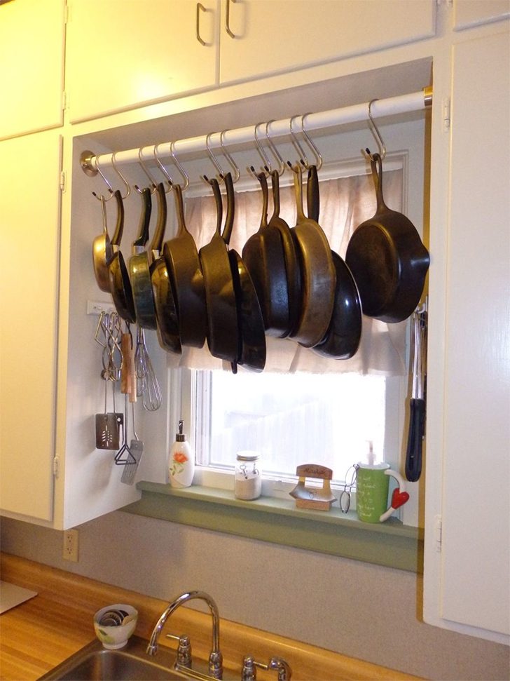 Unlock new heights in the kitchen’s organization with a hanging rack for pots and pans. By employing S-hooks on a sturdy bar, cookware floats effortlessly above, ensuring easy access and freeing up precious cabinet space. Is this method safe? Absolutely!