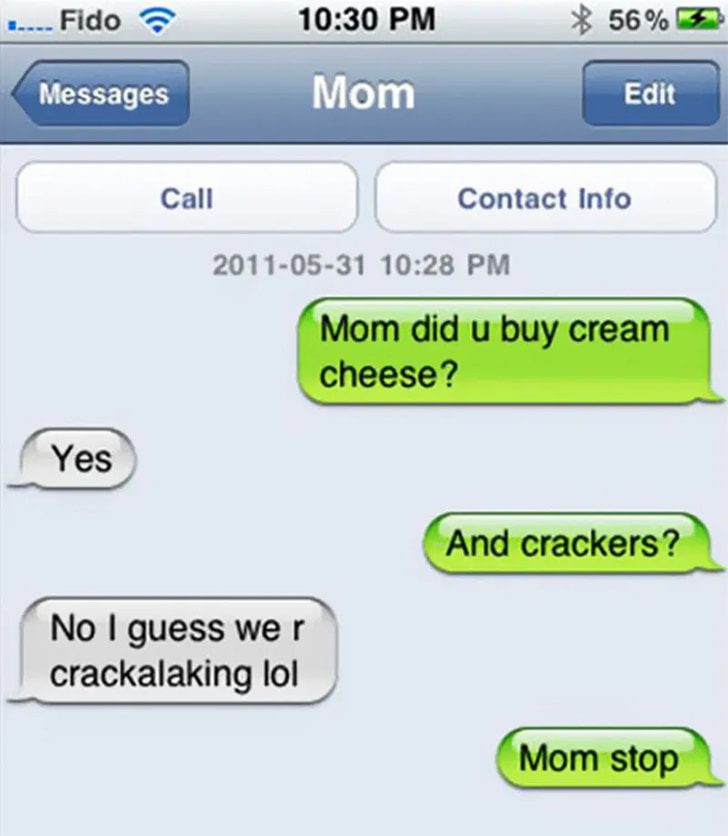 Strap in for a scrumptiously funny saga! A simple text to the mom inquires about cream cheese and crackers. The cream cheese? Check! But the crackers? Things took a punny turn. Mom couldn’t resist unleashing her inner comedian, declaring the crackers were “crackalacking.” She even added a cheeky “lol!”