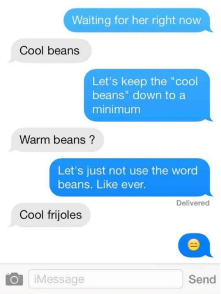 Trying to keep up with slang, a parent texted “cool beans” in reply to their child’s update, but it landed out of context. Unaffected by the misstep and quick to adjust, they tried “warm beans” and “cool frijoles” after that. Each attempt only resulted in an unimpressed emoji from the child.