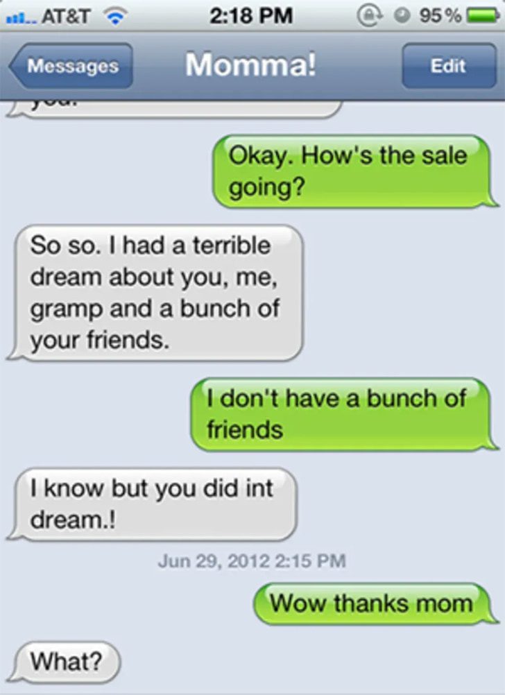 Casually texting her child, a mother revealed a terrible dream involving her child’s “bunch of friends.” The daughter, bemused, replied that she didn’t have a bunch of friends. The mother’s response? “I know, but you did in the dream.”