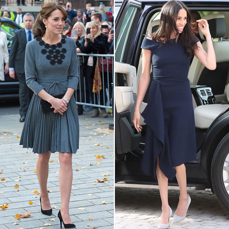 Elegance meets practicality as Kate Middleton dazzles in a grey Orla Kiely pleated dress and Meghan Markle radiates sophistication in a navy Roland Mouret Barwick garment. These outfits are crafted from heavy fabrics and incorporate a clever royal trick: dressmaking weights sewn into hems.