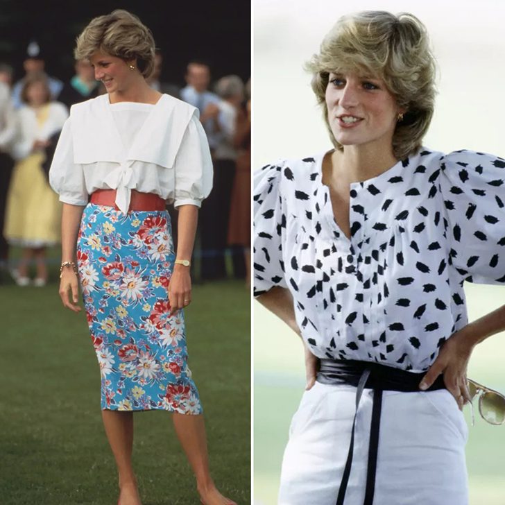 A sailor-style white blouse paired with a chunky brown belt and a boldly patterned skirt shows Princess Diana’s knack for balancing bold and classic elements. Another chic look at a 1983 polo match features a black-and-white top with printed puff sleeves, again demonstrating her impeccable sense of harmony.