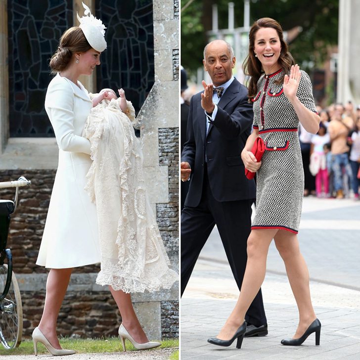 At Princess Charlotte’s christening in 2015 and the opening of a new exhibition at the Victoria & Albert Museum, Kate Middleton showcases her impeccable style with a pair of pumps. L.K. Bennett’s Sledge pumps, a favorite of hers, are often seen in her wardrobe.