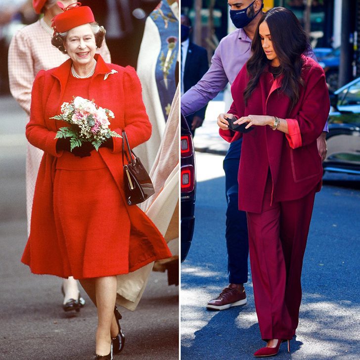 The royal family often makes bold statements with monochrome looks, as seen in these images. In 1989, Queen Elizabeth II wore a striking red ensemble for a visit to St Anne’s Church, complete with her signature handbag, pumps, and brooch. In 2021, Meghan Markle looked stunning in a maroon solid-colored outfit during her visit to New York.