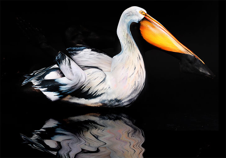It takes a second glance and maybe a slow blink to realize that this isn’t a photo of an actual pelican. Gesine Marwedel has somehow painted a human into a full-on bird without a single feather out of place. The beak, the wings, the posture—everything lines up so smoothly it almost feels like the model flew in from a wildlife documentary and settled into a yoga pose.