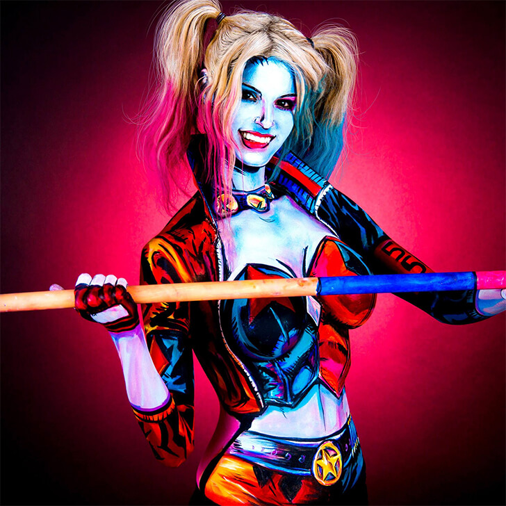 If chaos had a muse, she’s right here; head to toe in pure mayhem and grinning like she’s halfway through a double-cross. This isn’t cosplay, this is commitment. Whoever turned a bare body into Harley Quinn’s riot-ready alter ego didn’t miss a beat, from the faux zipper to that smile that practically whispers “Oops” before something explodes.