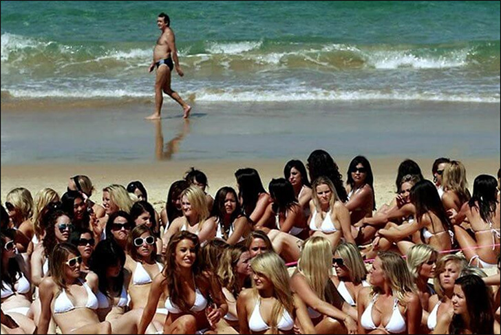 In 2007, Cosmopolitan magazine gathered over 1,000 models at Bondi Beach, Sydney, Australia, for the world’s largest swimsuit photoshoot. Among the sea of models posing perfectly a few feet away from him, a man in swimming trunks casually strolls by, blissfully unaware that he’s photobombing a world record attempt.