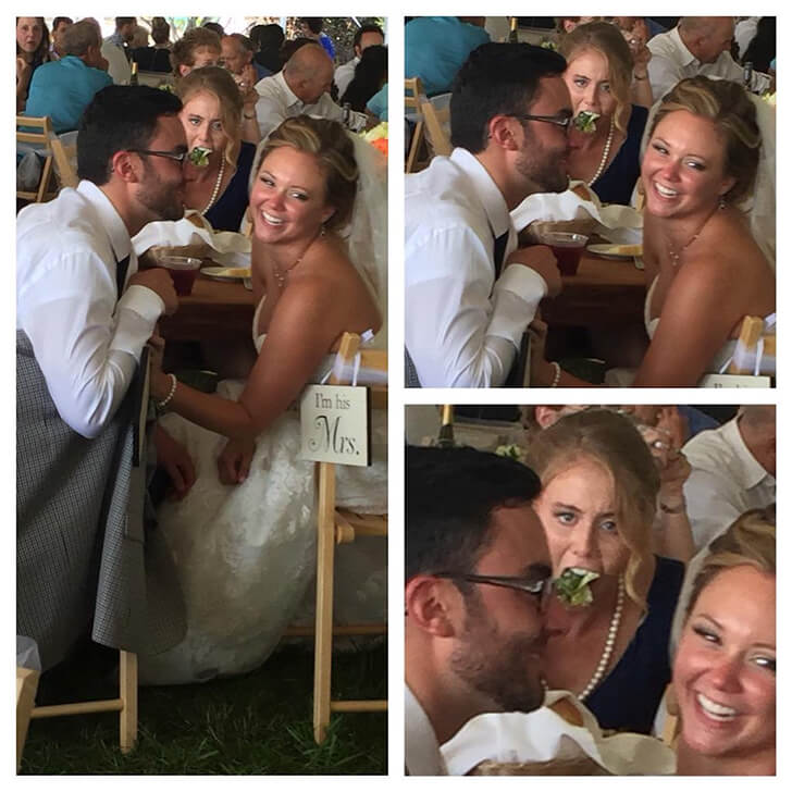 While the happy couple shares a romantic moment, their guest’s enthusiastic salad consumption steals a bit of the spotlight. This amusing photobomb adds an unexpected twist to the wedding festivities, reminding us that even at elegant events, there’s always room for a little unplanned humor.