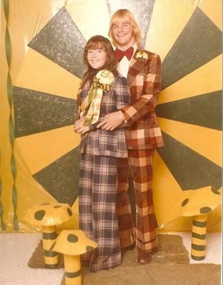 Their coordinated look is a charming nod to the trends of the time, capturing the playful spirit and unique style that defined the decade. It’s a delightful reminder of when fashion was about fun and making a statement. This couple’s matching attire is both a fashion throwback and a humorous snapshot of 1970s style, sure to bring smiles and nostalgia to anyone who sees it.