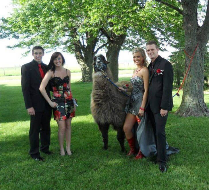 Two couples are posing for prom pictures, but instead of a limo, they’ve opted for a llama as their unique backdrop. Llamas, native to South America, particularly the Andes region, aren’t typically ridden like horses, but they make for quirky companions. Maybe they thought arriving with a llama would add a fun twist to their prom night.