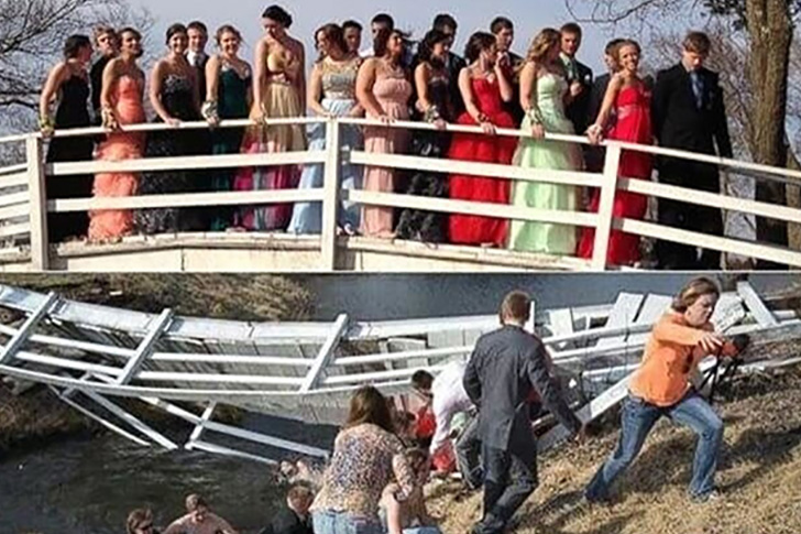 A group of high school students in Nebraska gathered on a wooden bridge for prom pictures, only to have the platform collapse under their combined weight. The unexpected plunge sent them splashing into the creek below. Some girls, submerged in the approximately 4-foot deep water, were quickly rescued and brought to safety.