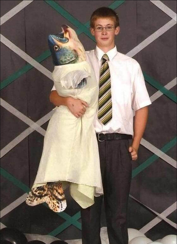 A boy poses for prom pictures with his unique date: a large fish in a dress. You have to wonder, why bring a fish to prom? Perhaps it’s a quirky inside joke, or maybe he wanted to make a splash with a truly unforgettable date. The elegantly dressed fish adds a hilarious twist to the traditional prom photo.