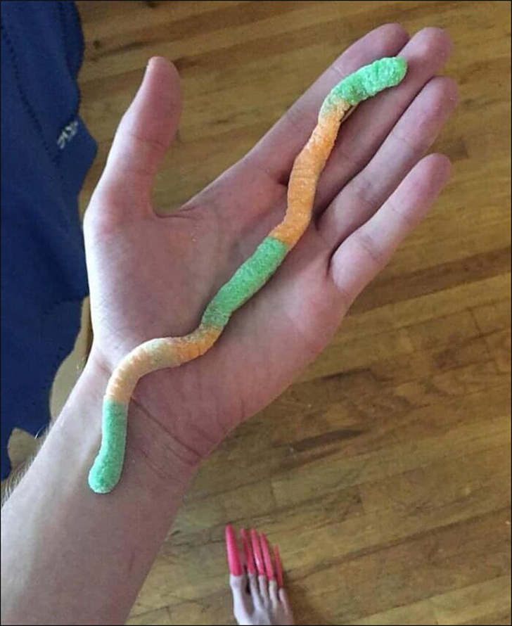 Someone’s holding a massive green and orange gummy worm that stretches from her fingertip down past her wrist. As of 2024, the world record for the longest gummy worm is an impressive 8 feet long and 26 pounds heavy! But that’s not all; her feet are stealing the show, too.