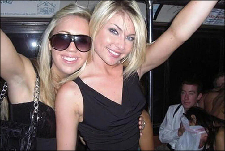 Two blonde women in sleek black dresses are all smiles for the camera, blissfully unaware of the chaos behind them. Look closely, and you’ll spot a woman in the background puking into a white bag held open by a man with a look of utter resignation. His expression screams, “I’d rather be anywhere else right now!”