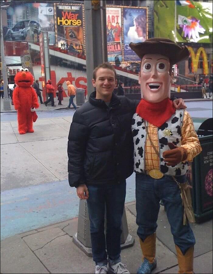 A man in denim trousers and a black jacket poses happily next to Woody from “Toy Story.” But wait, in the background, Elmo from “Sesame Street” is giving them a look of pure betrayal and hurt. Why the drama? Elmo is one of the Muppets and everyone’s favorite red monster from “Sesame Street.”