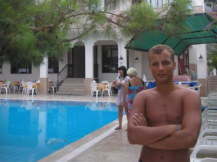 A young man stands by the pool, arms folded and posing confidently for the camera. Meanwhile, behind him, a woman is captured mid-tilt, about to take an unplanned dip into the pool. Although laughing, she appears surprisingly calm, with no frantic arm-flailing, just moments from making a splash.