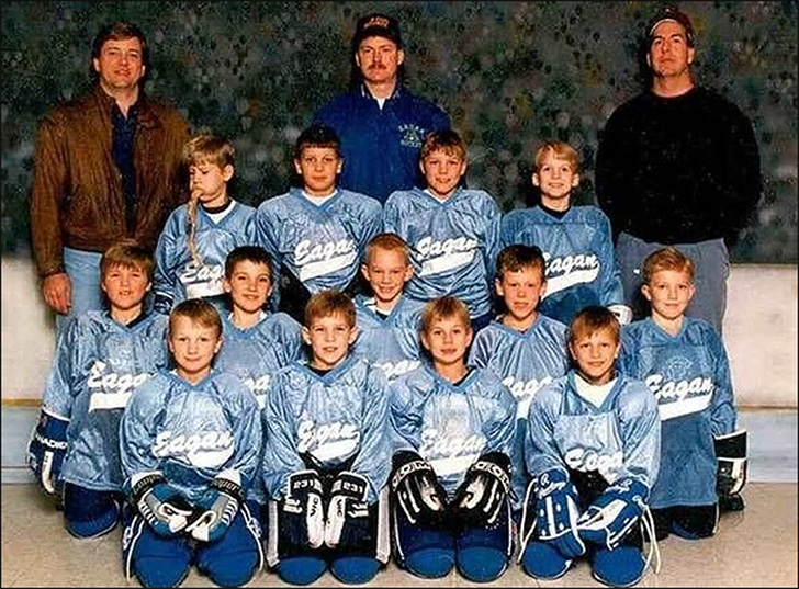 A team of young, male hockey players is all smiles, posing for a group picture. Behind them, three men, likely their coaches, stand proudly. But if you look closely at the top left, one child is captured mid-vomit! Hockey might be intense, but it’s not usually a sport that makes players queasy.
