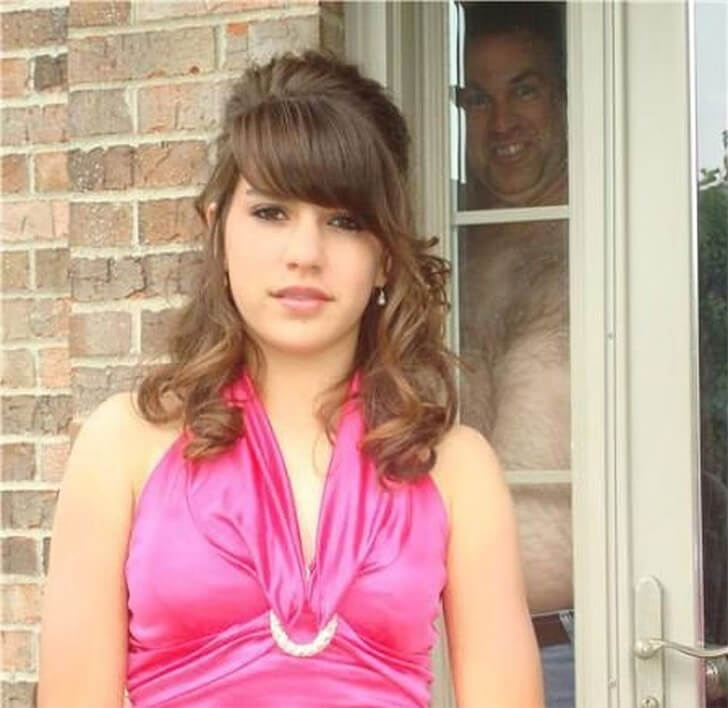 An attractive young girl stands outside her house, looking stunning in an elegant pink dress with styled hair, ready for prom. But unknown to her, her shirtless dad is in the window behind her, sporting a goofy grin. With his large tummy and hairy chest, he’s adding a hilarious twist to her glamorous moment.