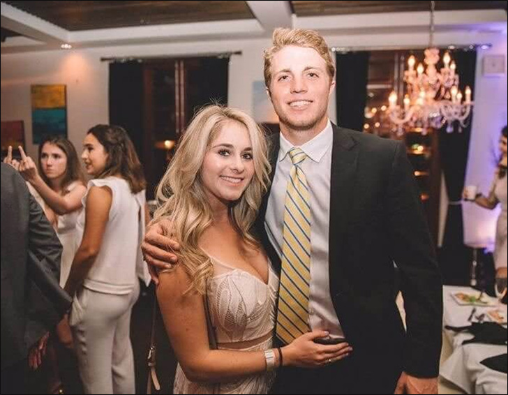 A blonde man and woman embrace each other, beaming happily at the camera. Their joyful moment, however, takes a hilarious twist thanks to the background action. Behind them, two people are deep in conversation, but one woman steals the show by defiantly holding up two middle fingers at someone off-camera.